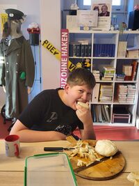 Simon beißt in eine Zwiebel