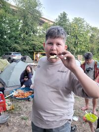 Simon beißt in eine Calzone (italienischer Döner)